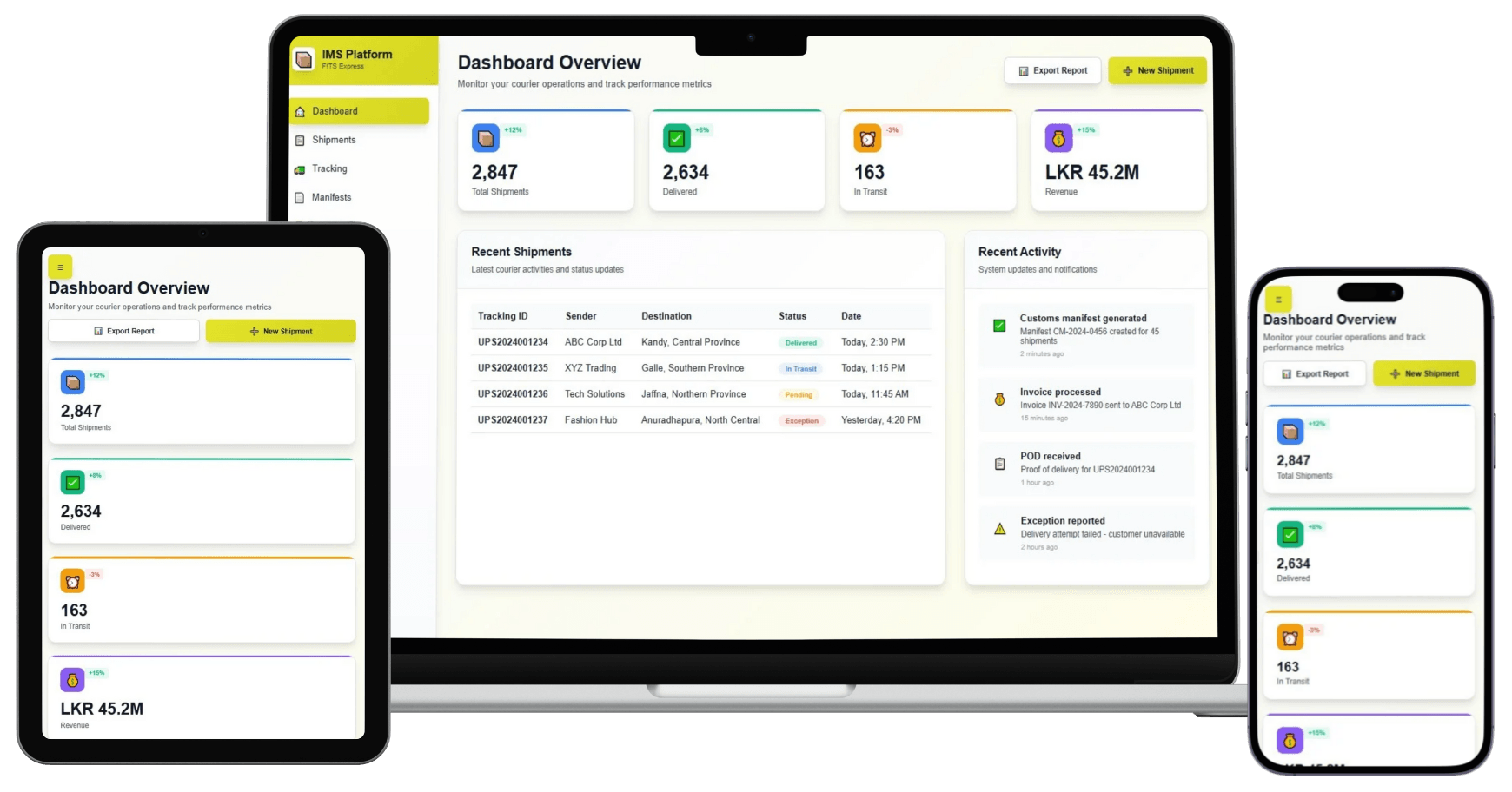 IMS is a courier management platform for FITS Express, the official ASC for UPS in Sri Lanka. The IMS automates key operations including customs manifest generation, shipment invoicing, delivery tracking, and real-time reporting (PODs and exceptions)