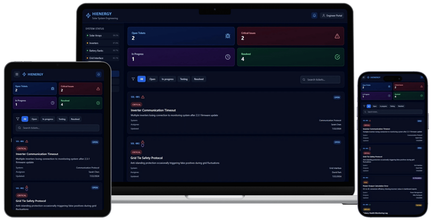 We developed a custom ticketing system for HIENERGY to support system engineers in managing and resolving solar energy issues efficiently. The platform allows users to create, track, and manage tickets related to various system faults such as panel output drops, inverter failures, battery issues, and more. With features like categorized issue types, photo uploads, status tracking, and solution references, the system ensures smooth communication between field engineers and the technical support team. It’s fully optimized for both desktop and mobile use to support on-site operations.